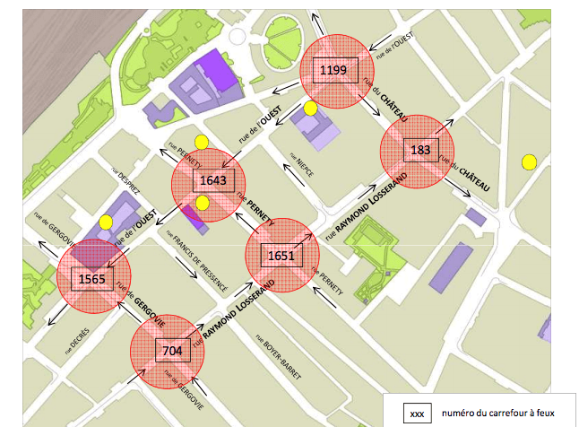 Traffic lights started to be interrupted at a few crossroads where the speed was limited at 30km/h (figure 1). After eight months of experience, the statistics showed a diminution of accidents in these experimental sectors and a diminution of the pollution in these areas during the period of the experience.